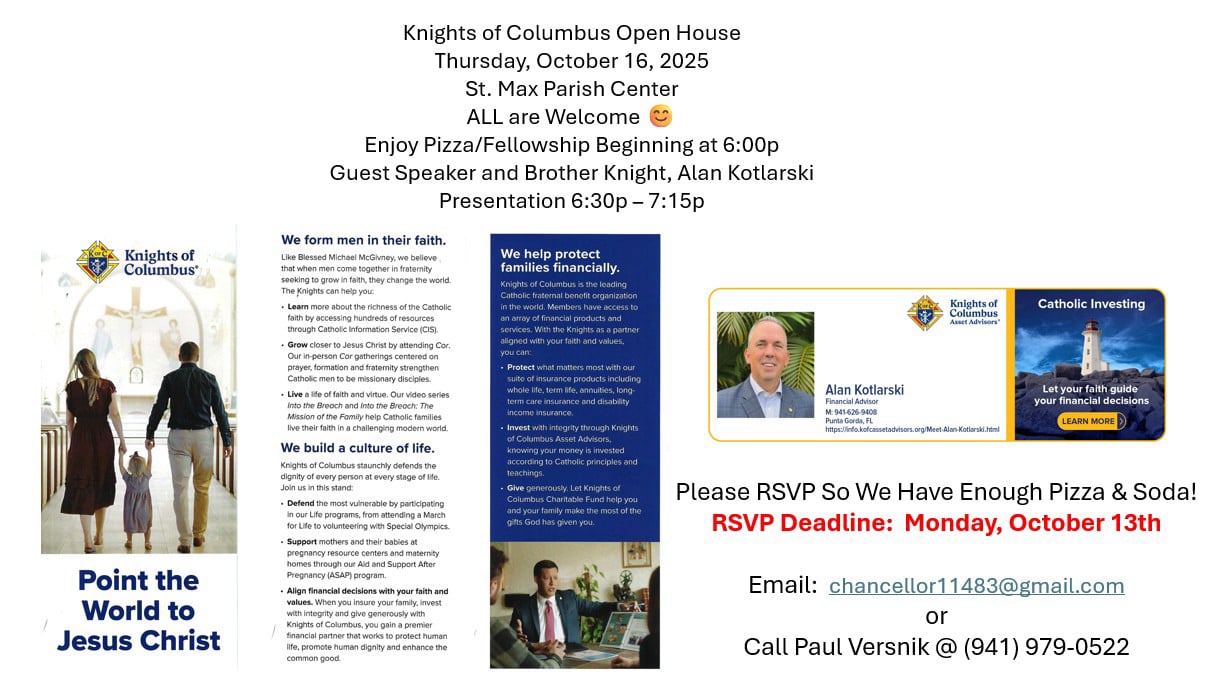 Brothers, Please be reminded of our Open House coming up on October 16th. This is a great way to learn of all your Fraternal Benefits and is open to EVERYONE. Please bring your friends and family to explore opportunities that the Knights' offer in securing your financial future.